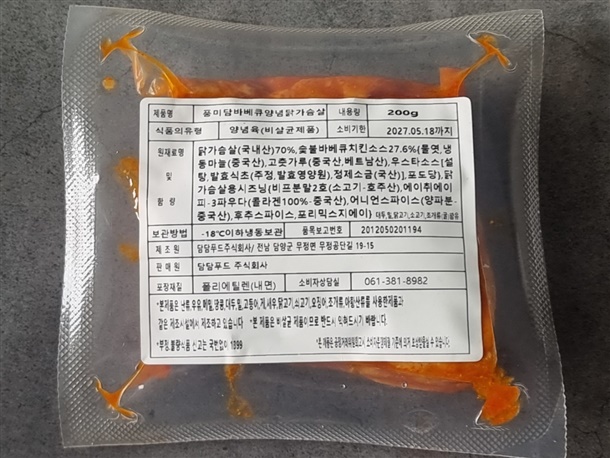 바베큐 양념 닭가슴살 - 닭가슴살(국내산) 70%, 숯불바베큐치킨소스 27.6%
