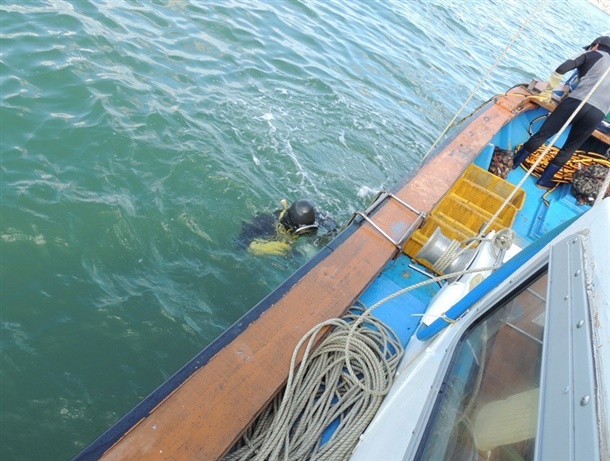3. 속살을 다시 건져 내장만 따로 가위 등을 이용하여 분리 후 5분 더 데쳐준 후 찬물에 세척합니다.
