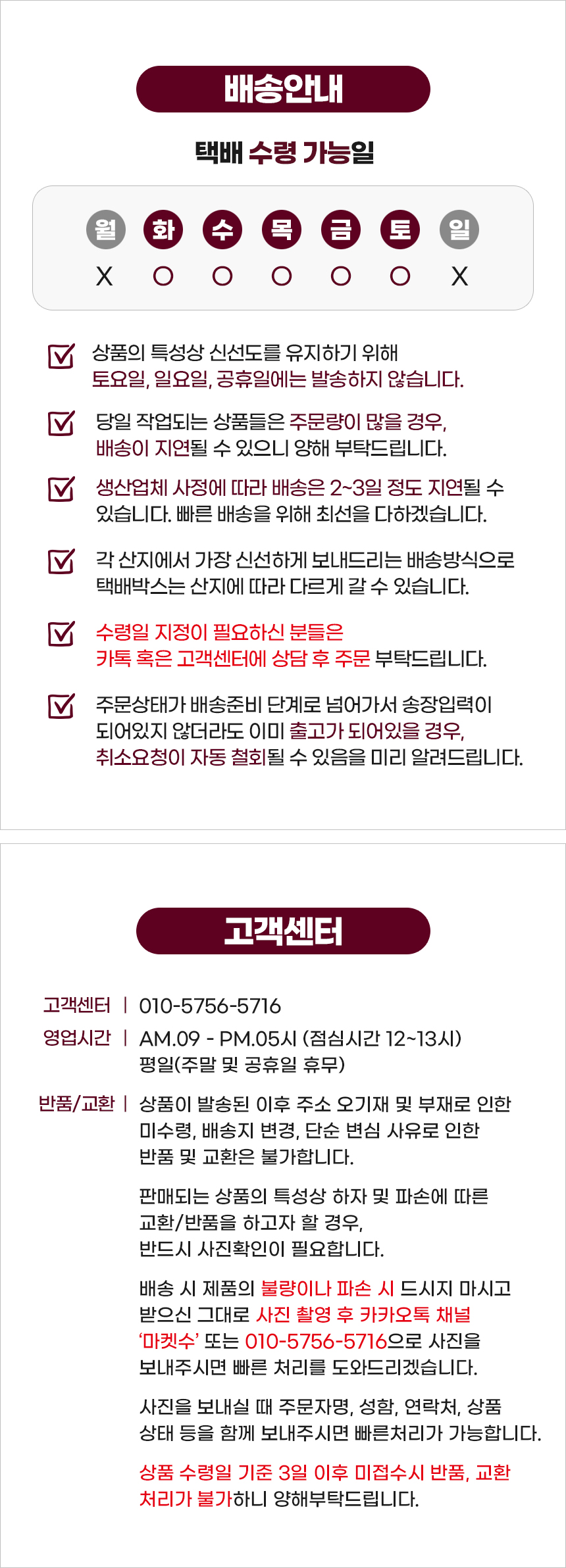 · 배송은 입금확인된 날짜로부터 1~3일 소요되며 최대 7일 이내 출고됩니다. (공휴일, 기상악화 등 불가피한 상황에 따라 추가 지연될 수 있습니다.)