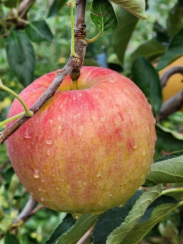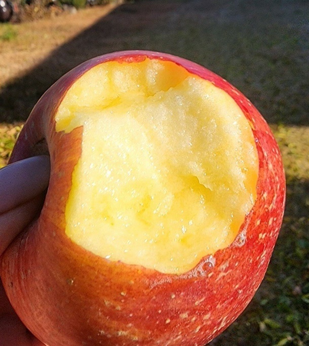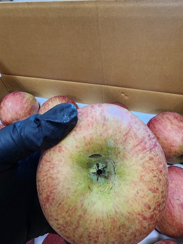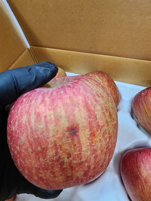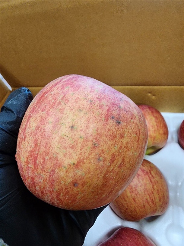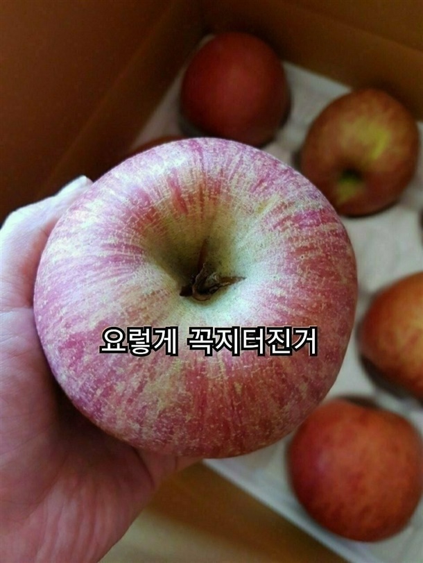 일부 사과는 꼭지 쪽이 살짝 터졌거나