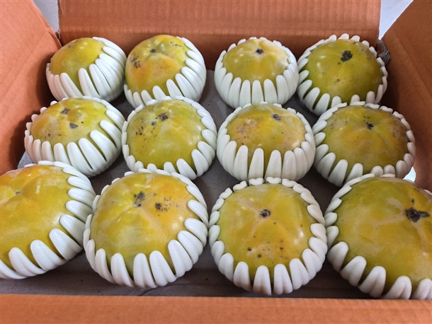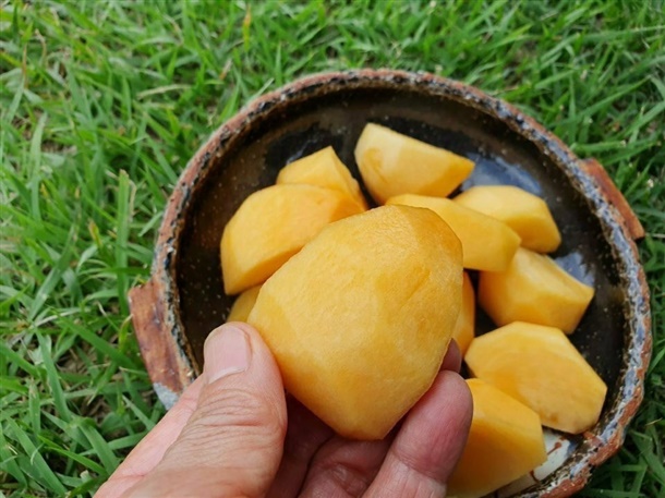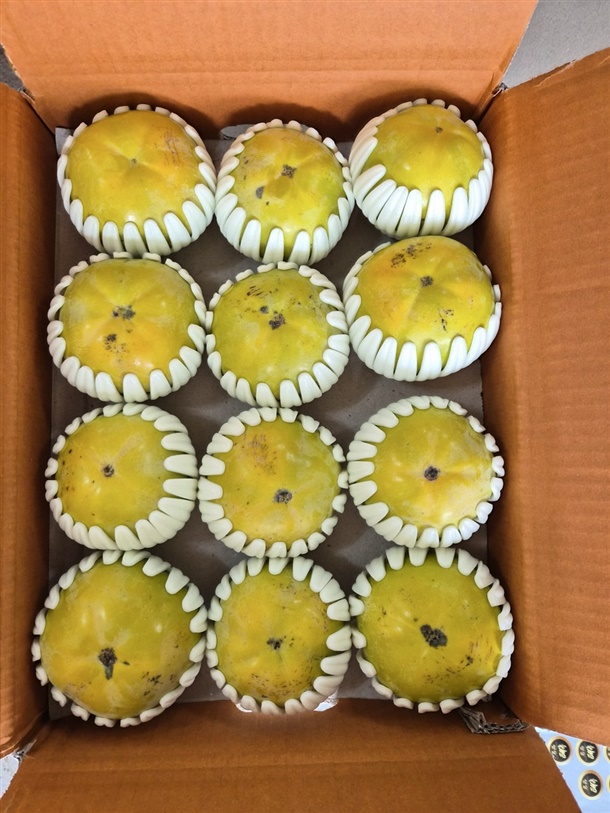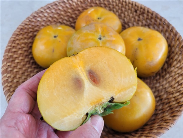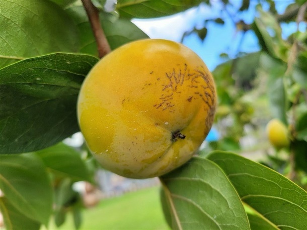 빨갛지는 않고 푸른색에 검은점과 줄이 많이 있는 단감입니다