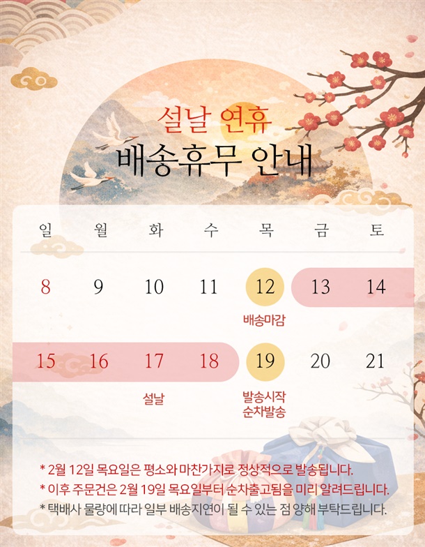 · 배송은 입금확인된 날짜로부터 1~3일 소요되며 최대 7일 이내 출고됩니다. (공휴일, 기상악화 등 불가피한 상황에 따라 추가 지연될 수 있습니다.)